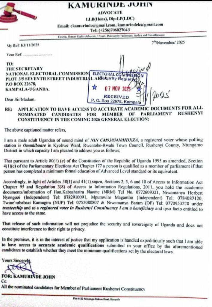 He wants the EC to release certified copies of the academic documents submitted by the candidates: Hon. Naome Kabasharira (NRM), Nuwamanya Herbert Nyongozi (Independent), Mpumwire Magambo (Independent), Twine’ Mbabazi Kamugira (NUP), and Nuwamanya Barham (DF).