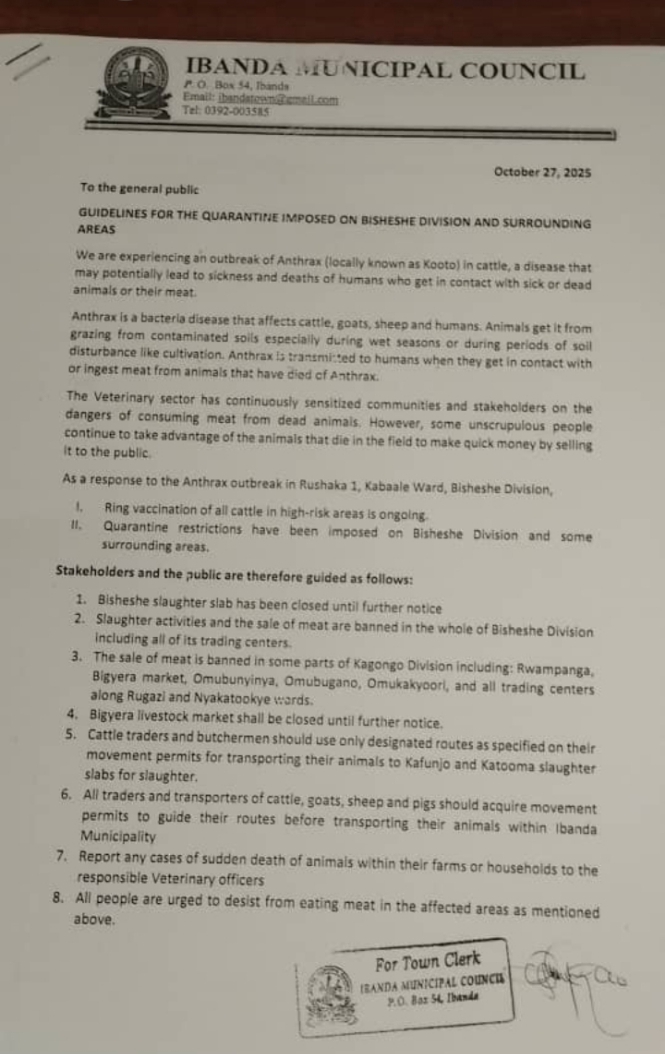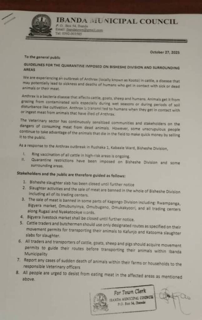 The Ibanda Municipal Council has imposed a quarantine on Bisheshe Division and surrounding areas following an outbreak of anthrax, locally known as Kooto, which has affected cattle and poses a serious threat to human health.