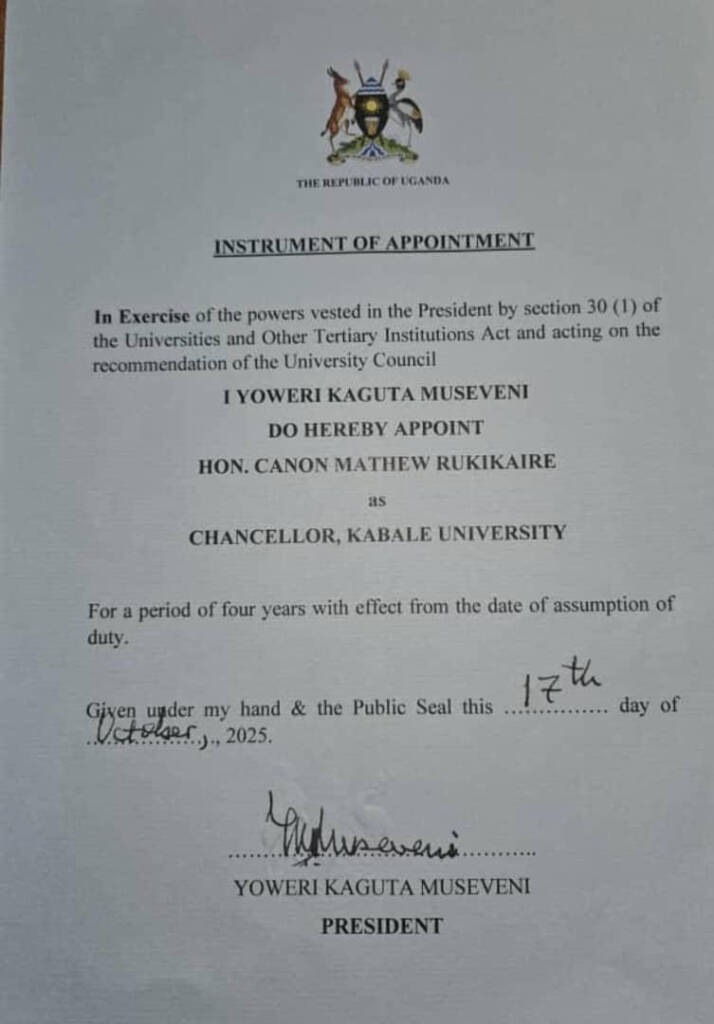 “I, Yoweri Kaguta Museveni, do hereby appoint Hon. Canon Mathew Rukikaire as Chancellor, Kabale University, for a period of four years with effect from the date of assumption of duty.”